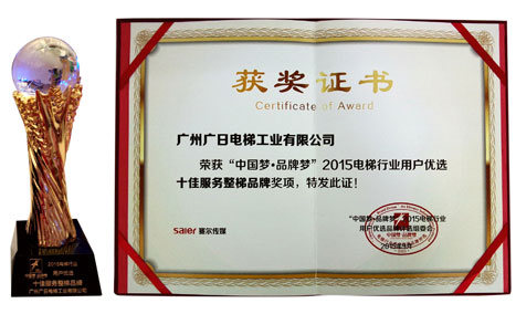¡°2015µçÌÝÐÐÒµÓû§ÓÅѡʮ¼Ñ·þÎñÕûÌÝÆ·ÅÆ¡± Ö¤Êé¼°½±×ù£º